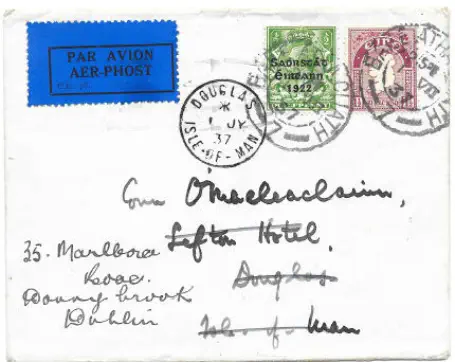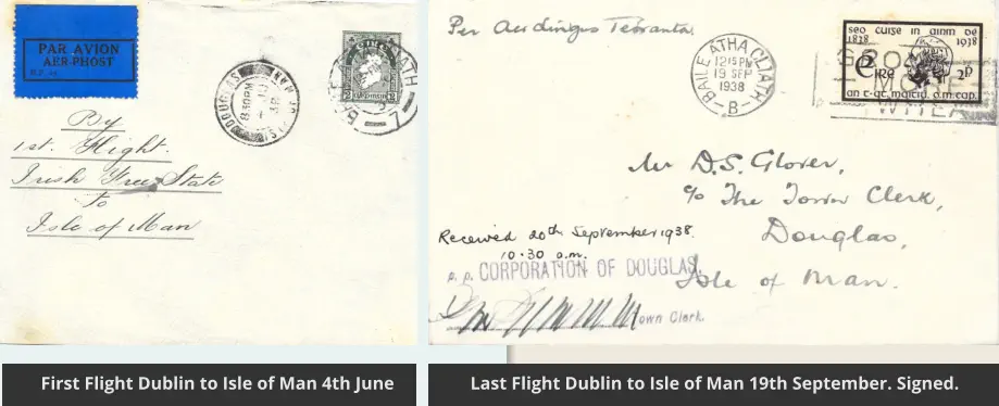 The service between the Isle of Man and Dublin was instituted by the Irish Postal Authorities as an experiment mainly for Irish holidaymakers in the Isle of Man and in order to facilitate the and expedite the transmission of mail from Dublin to the island. The company issued no special envelopes to celebrate the occasion nor have the company ever applied cachets to flown covers. Because the company did not require Air labels it can be difficult to distinguish between flown and boat mail. Although the passenger service went in both directions, mail was only sent from Dublin to the Isle of Man.