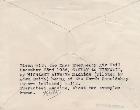 Commercial cover from Stronsay to Kirkwall sent to the Director of Education at Kirkwall. Signed by the pilot Adam Smith, who endured appalling conditions (75Mph winds) to complete the journey.