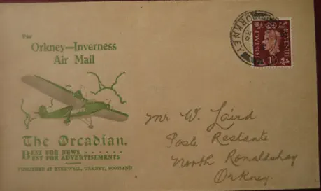 The Orcadiana Orkneys weekly newspaper produced two envelopes for the first flight and an envelope for general use after the first flight. There were 2 variations of the first and second type and 3 variations of the third type.