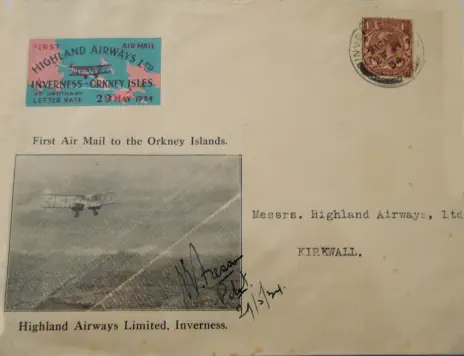 On the 29th May 1934, Highland Airways flew the historic first flight being the first Company with an air mail contract. Importantly the mail was sent by air at no additional cost to the sender. All previous air mail had included an ‘air premium’ normally in the form of a stamp with a fee to be paid in addition to the cost of postage. This system would remain in place until 1951 when BEA introduced an air letter service that increased the cost of airmail above the cost of normal postage.Highland Airways produced a company envelope ‘First Air Mail to the Orkney Islands’ above a photo of a plane landing. Underneath ‘Highland Airways Ltd Inverness’. 400 envelopes were produced and 200 flown in each direction. 100 of each flight had a Highlands Airway vignette. The envelope does not indicate the direction of the flight, this can only be ascertained by the postmark. Vignettes were produced both for the original Kirkwall flight and for the Wick extension.