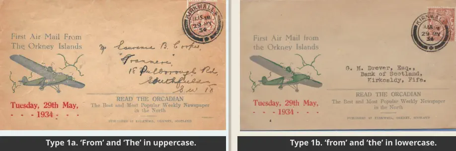 Type 1 of the Orcadian envelope is for mail on the first day from the Orkney Islands to Inverness. There are two variants of this envelope.Variant a. The text above the plane reads ‘First Air Mail From /The Orkney Islands’. Important to note here is that the ‘From’ and the ‘The’ both start with a capital letter.Variant b. The text above the plane reads ‘First Air Mail from /the Orkney Islands’. Important to note here is that the ‘from’ and the ‘the’ both start with lowercase letters.